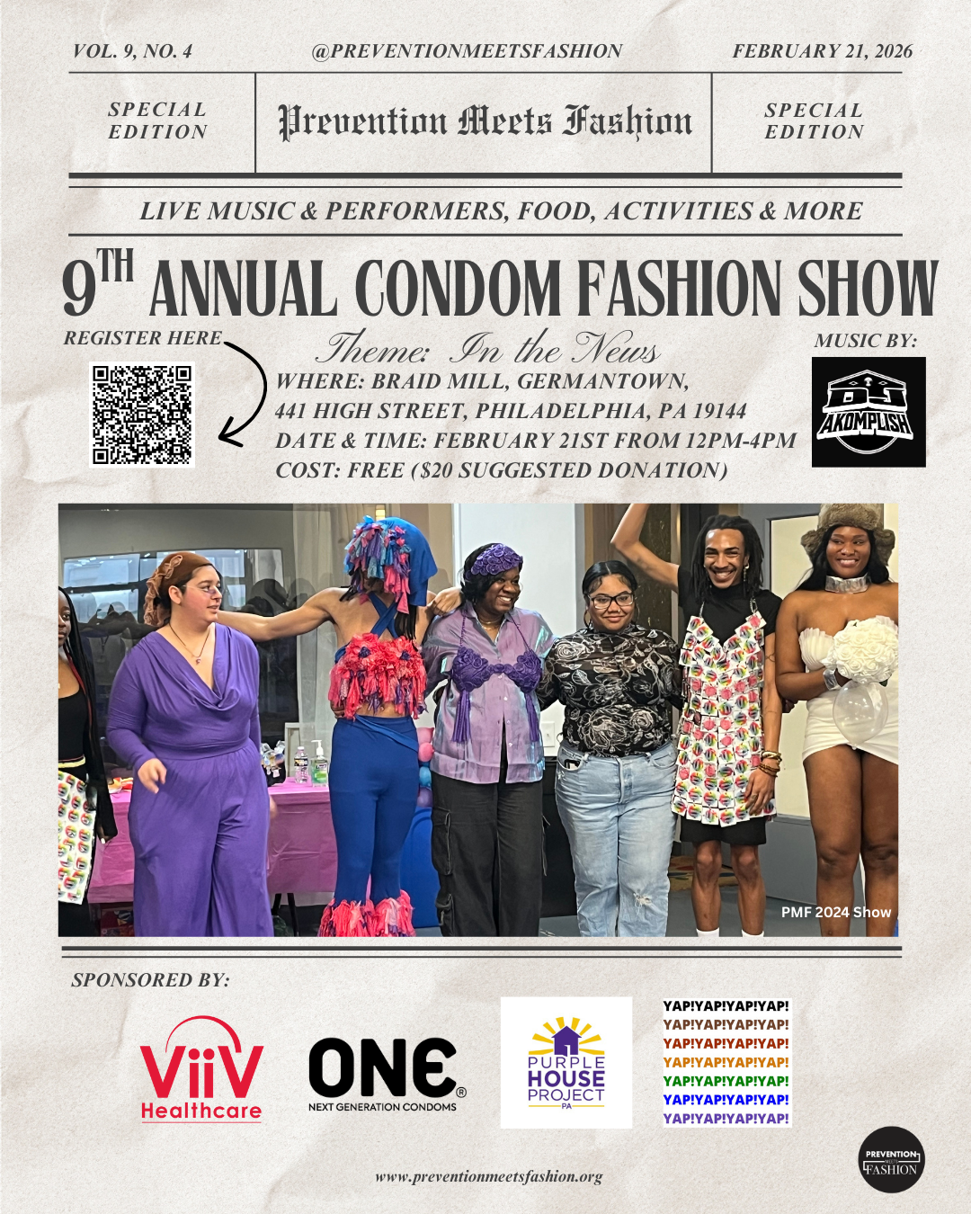 Prevention Meets Fashion (PMF) will be hosting our 9th annual condom fashion show and education event on Saturday, February 21, 2026 from 12p-4pm, Braid Mill located at 441 High Street, Philadelphia, PA 19144.